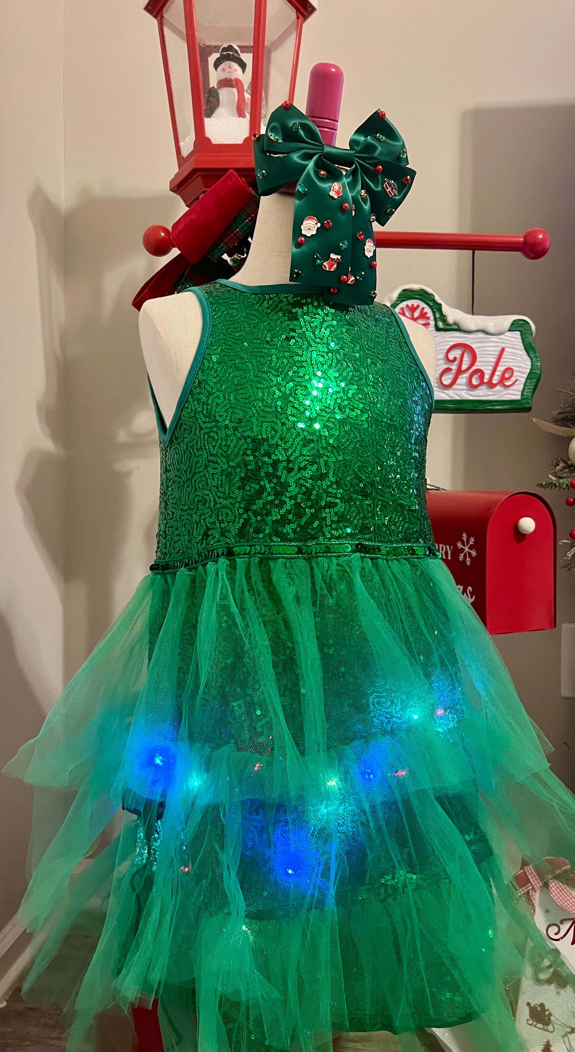Emerald green sequin dress with layered tulle and built-in twinkle lights — a true Christmas showstopper. Bow sold separately.